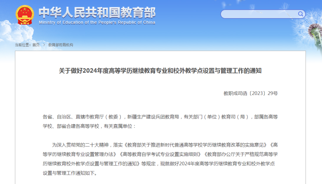 為深入貫徹黨的二十大精神,落實《教育部關于推進新時代普通高等學校學歷繼續(xù)教育改革的實施意見》《高等學歷繼續(xù)教育專業(yè)設置管理辦法》《高等教育自學考試專業(yè)設置實施細則》《教育部辦公廳關于嚴格規(guī)范高等學歷繼續(xù)教育校外教學點設置與管理工作的通知》等規(guī)定,現(xiàn)就做好2024年度高等學歷繼續(xù)教育專業(yè)和校外教學點設置與管理工作通知如下。